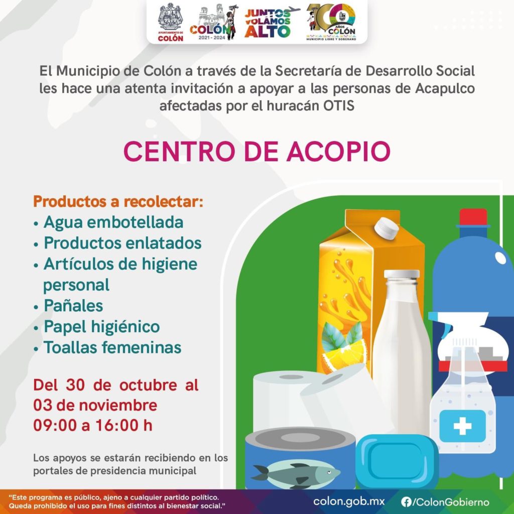 Como apoyo a los damnificados por el Huracán “Otis” que azotó el estado de Guerrero, el municipio de Colón abre un Centro de Acopio; así lo dio a conocer el edil Manuel Montes Hernández.