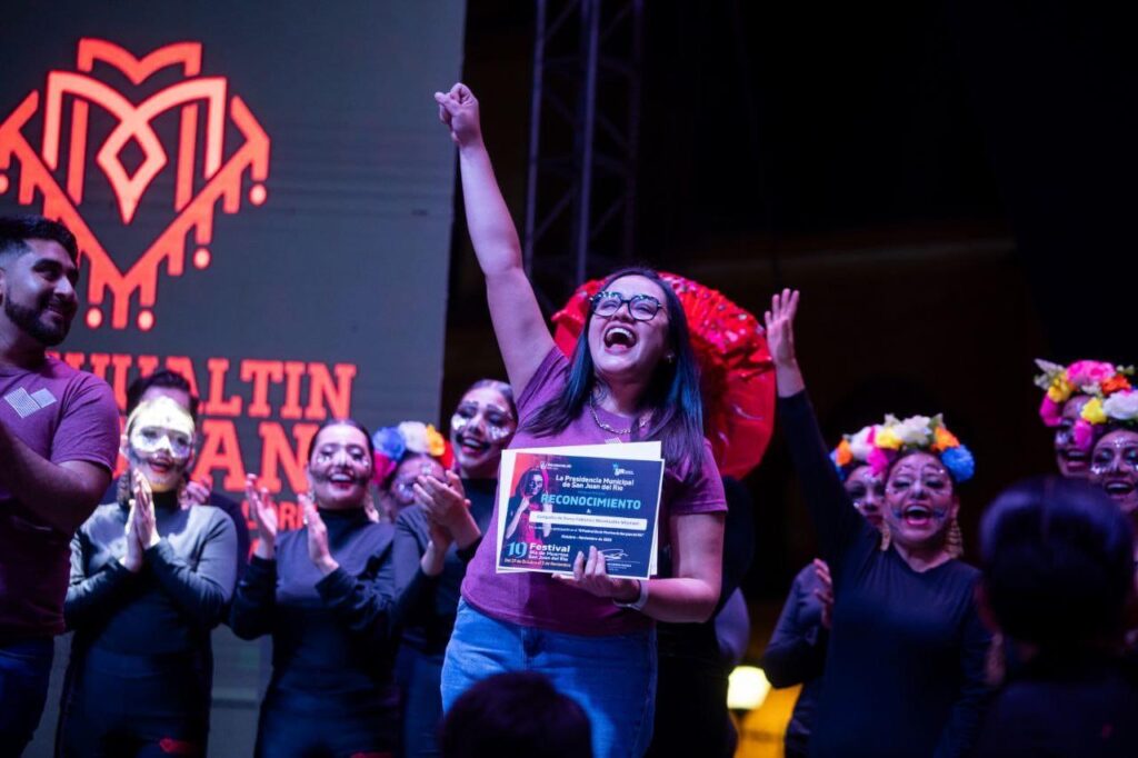 En el marco del 19º Festival de Día de Muertos San Juan del Río 2025, la Compañía de Danza Folklórica Mecehualtin Mitotiani realizó la presentación del espectáculo “Fiesta en el Mictlán” en la Plaza Independencia, evento que fue presenciado por las y los sanjuanenses que, en un ambiente festivo y familiar, disfrutaron cada uno de los actos que formaron parte de esta presentación.