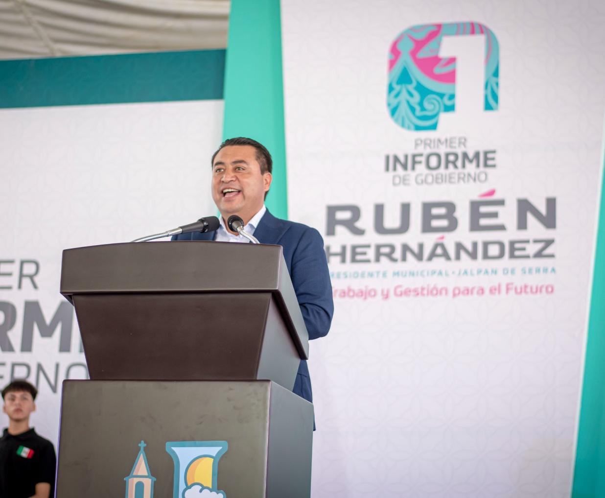 Este día, el presidente municipal de Jalpan, Rubén Hernández, acompañado de su esposa Ceci Ugalde, sus hijas, familiares, la secretaria de las Mujeres Sonia Rocha —en representación del Gobernador del Estado—, autoridades municipales, estatales y federales, así como presidentes y expresidentes municipales, presentó su Primer Informe de Gobierno.
