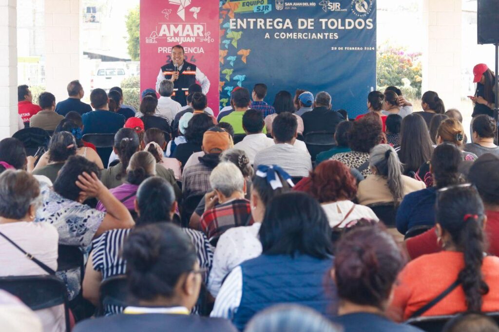 En equipo, el presidente municipal de San Juan del Río, Roberto Cabrera Valencia y el titular de la Secretaría de Participación Ciudadana, Gregorio Mondragón Mendoza, a través del Programa Mi Querido San Juan, entregaron 90 toldos para comerciantes de La Rueda, El Pedregoso y Fundadores.