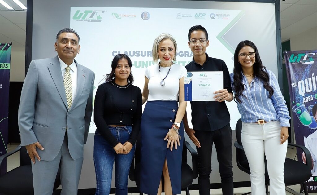 La rectora de la Universidad Tecnológica de Corregidora (UTC), Ana Eugenia Patiño Correa, en compañía del director general del Colegio de Estudios Científicos y Tecnológicos del Estado de Querétaro (CECyTEQ), David Chaparro Aguilar y la directora de Vinculación del Colegio de Bachilleres (COBAQ), Wendy Mariana Sánchez González, celebraron la clausura del programa Pre-Universitario UTC 2024, que tuvo la participación de 120 estudiantes de distintos planteles de Corregidora y Huimilpan.