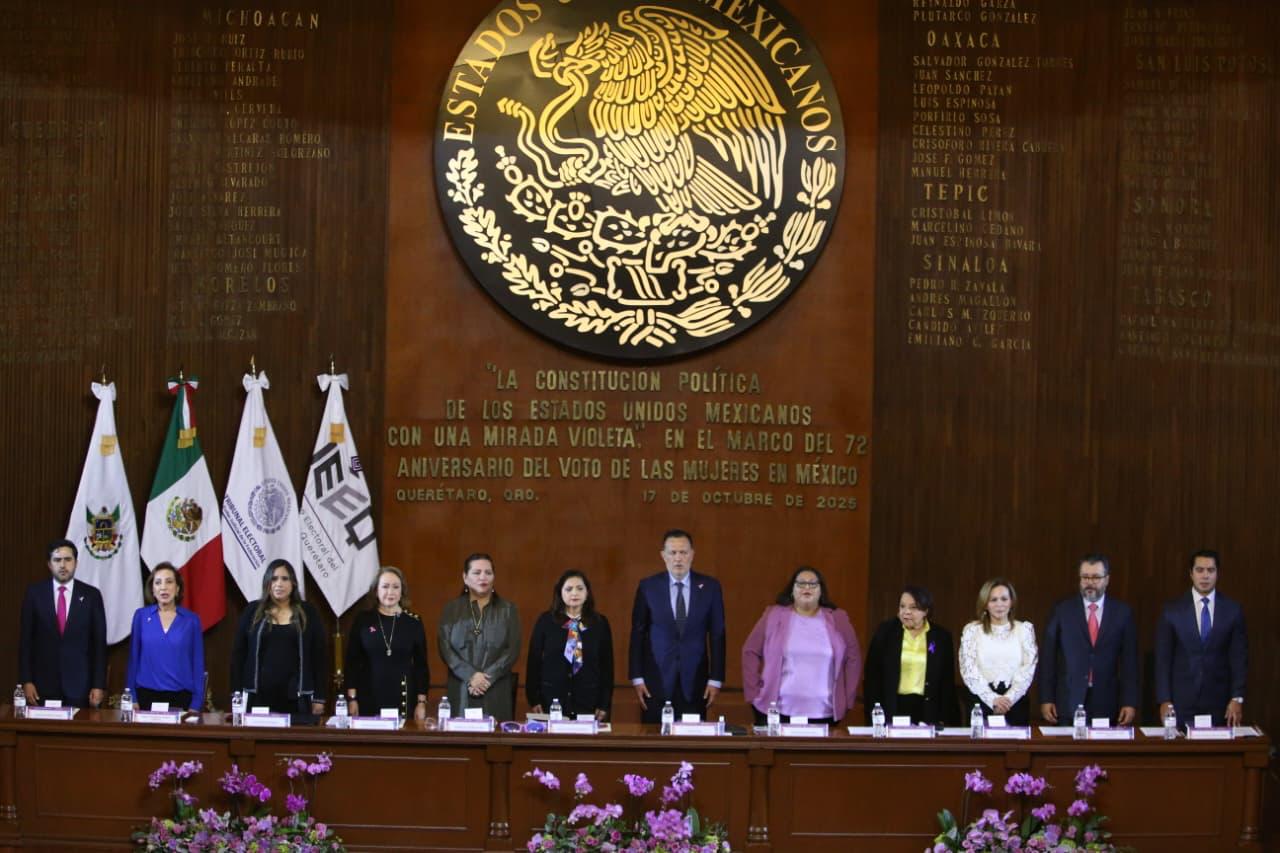 El Instituto Electoral del Estado de Querétaro (IEEQ) y el Tribunal Electoral del Poder Judicial de la Federación (TEPJF), a través de la Dirección General de Igualdad de Derechos y Paridad de Género, presentaron “La Constitución Política de los Estados Unidos Mexicanos con una Mirada Violeta”, en el marco del 72 Aniversario del voto de las Mujeres en México.