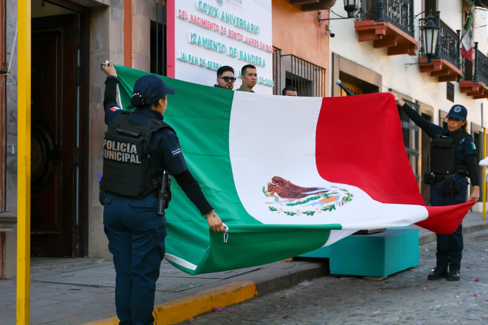 La mañana de este jueves, el Presidente Municipal, Rubén Hernández, y la Presidenta del Patronato del SMDIF, Cecilia Ugalde, encabezaron el izamiento de la Bandera Nacional en conmemoración del natalicio de Benito Juárez García, figura emblemática de la justicia, igualdad y democracia en México.