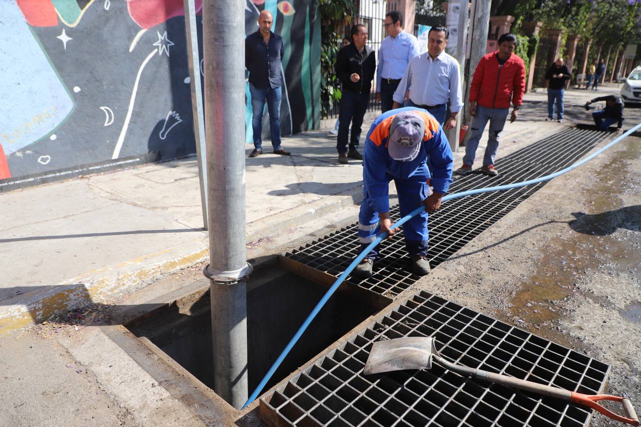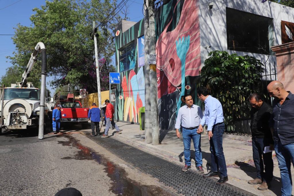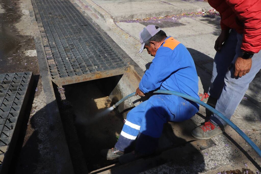 El Presidente Municipal supervisó los detalles de trabajo en la colonia Hércules, donde una cuadrilla compuesta por tres personas trabaja con un equipo de desazolve hidroneumático y una pipa para suministrar el agua que durante el proceso sale a presión y a través de la succión se eliminan los materiales acumulados en las rejillas del sistema pluvial.