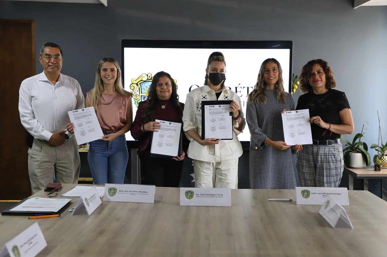 La Presidenta del Patronato del Sistema Municipal DIF, Arahí Domínguez, atestiguó la firma del convenio entre la Secretaría de la Mujer del Municipio de Querétaro y la Junta Local Ejecutiva en el Estado de Querétaro del Instituto Nacional Electoral (INE), para coordinar acciones para proteger los derechos humanos, especialmente los de las mujeres, y promover la cultura democrática y la participación ciudadana informada.