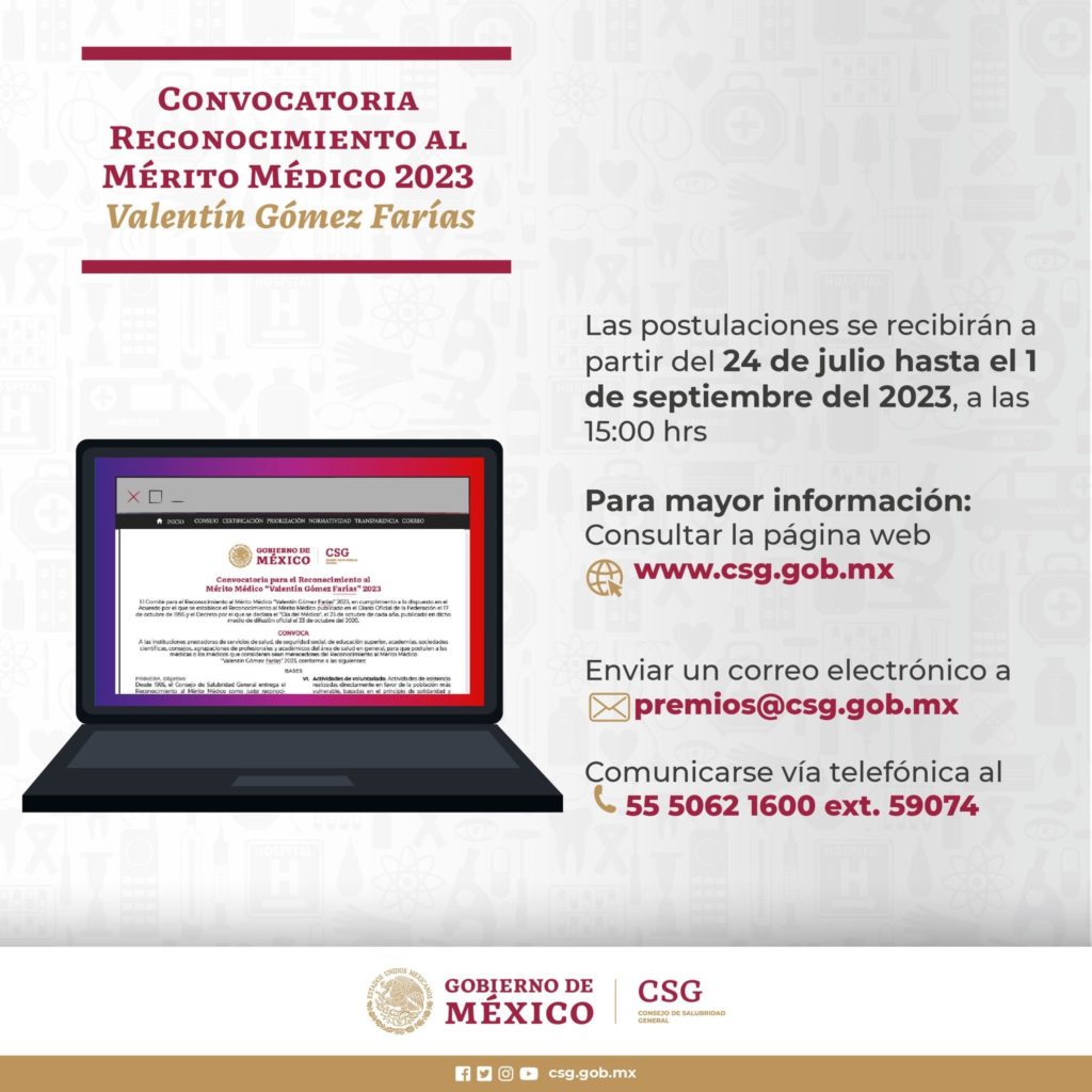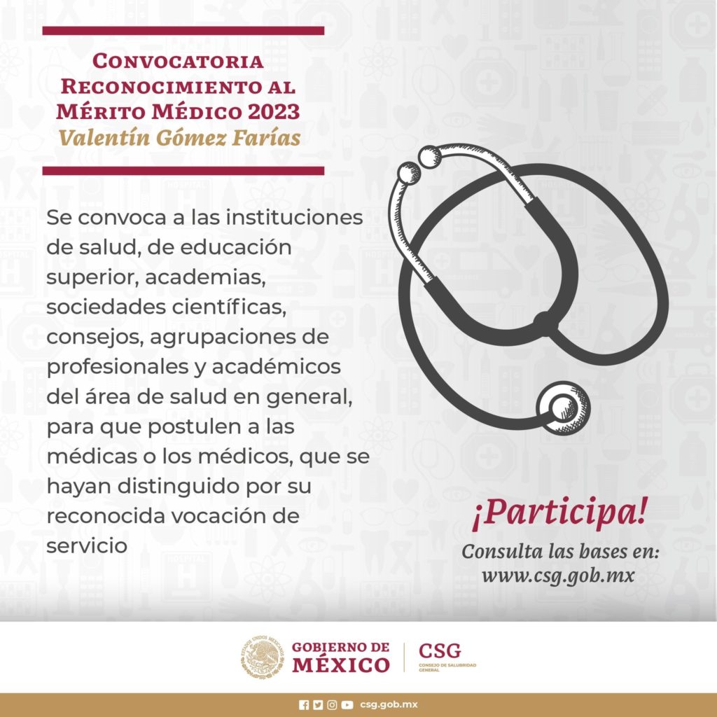 La Secretaría de Salud (SESA) del estado de Querétaro informa que el Comité para el Reconocimiento al Mérito Médico “Valentín Gómez Farías” 2023, convoca a las instituciones prestadoras de servicios de salud, de seguridad social, de educación superior, academias, sociedades científicas, consejos, agrupaciones de profesionales y académicos del área de salud en general, para que postulen a las médicas o los médicos que consideren sean merecedores de tal distinción.
