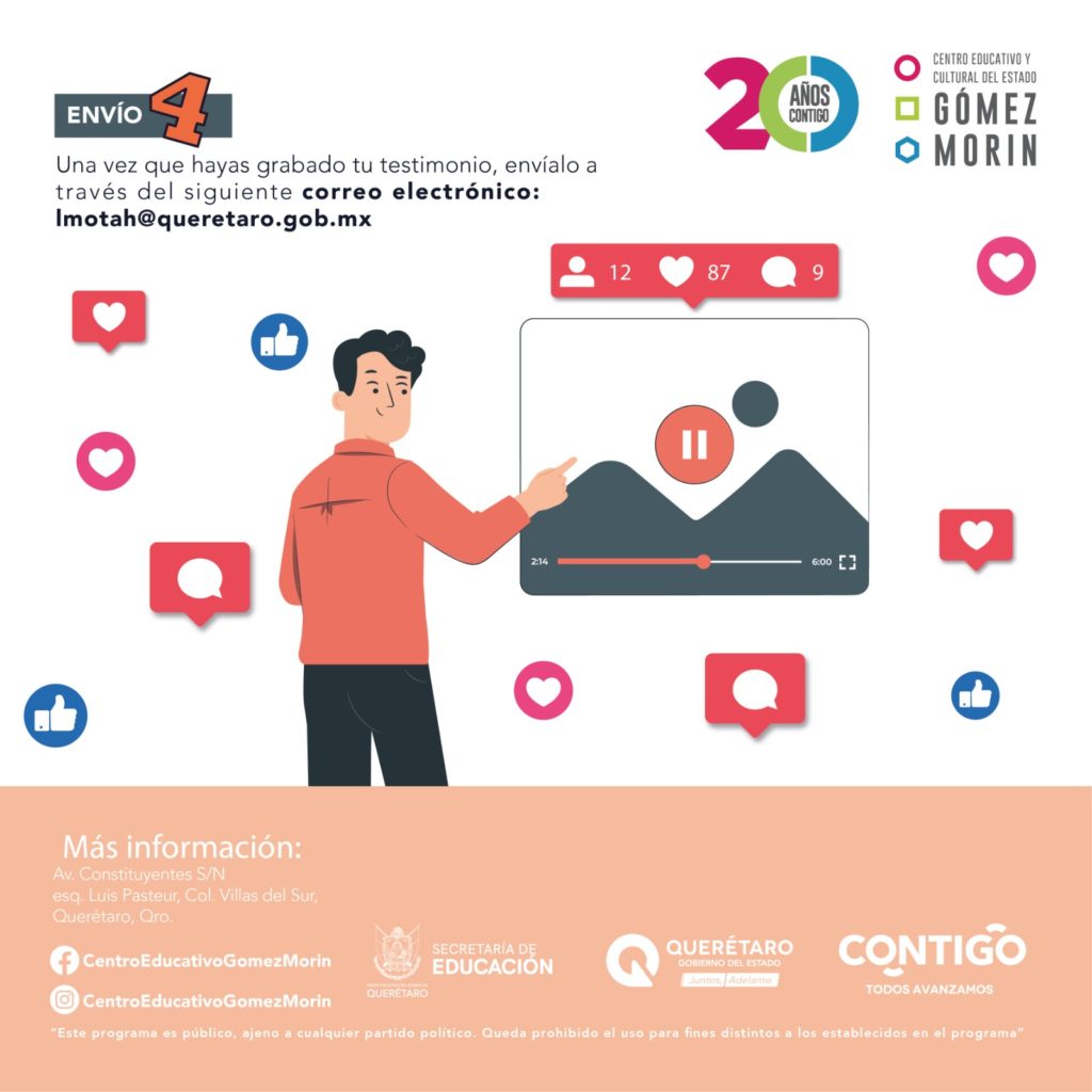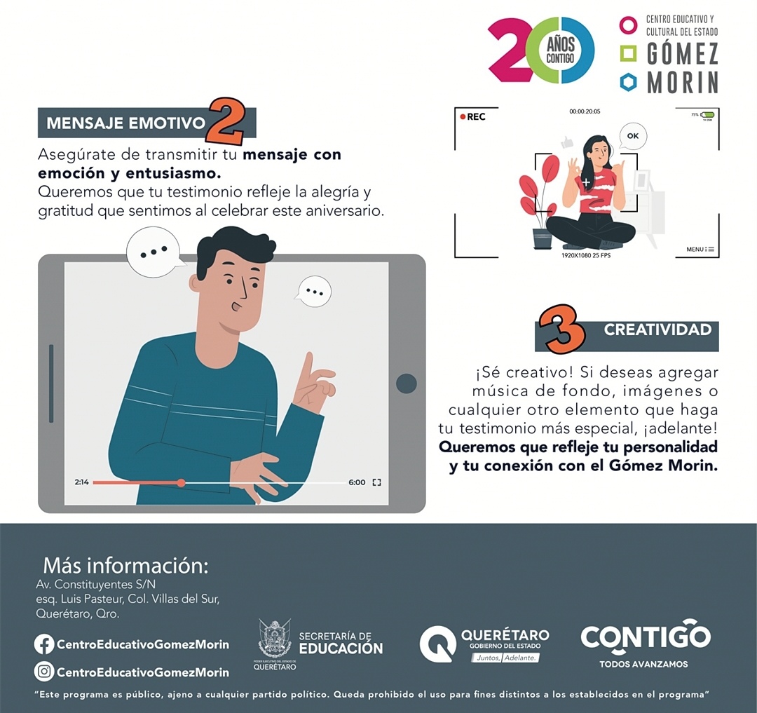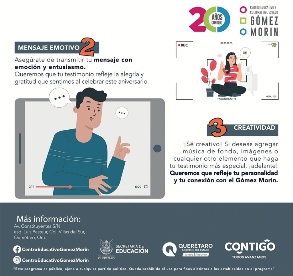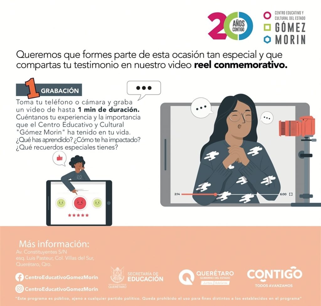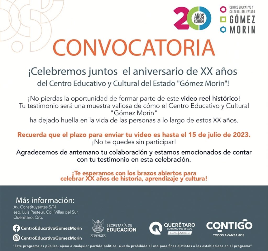 Como parte del 20 aniversario del Centro Educativo y Cultural «Manuel Gómez Morin», el director general, Emanuel Contreras Martínez, invitó a las y los queretanos a realizar un reel/video corto que refleje la influencia e impacto que este recinto ha tenido en su formación.