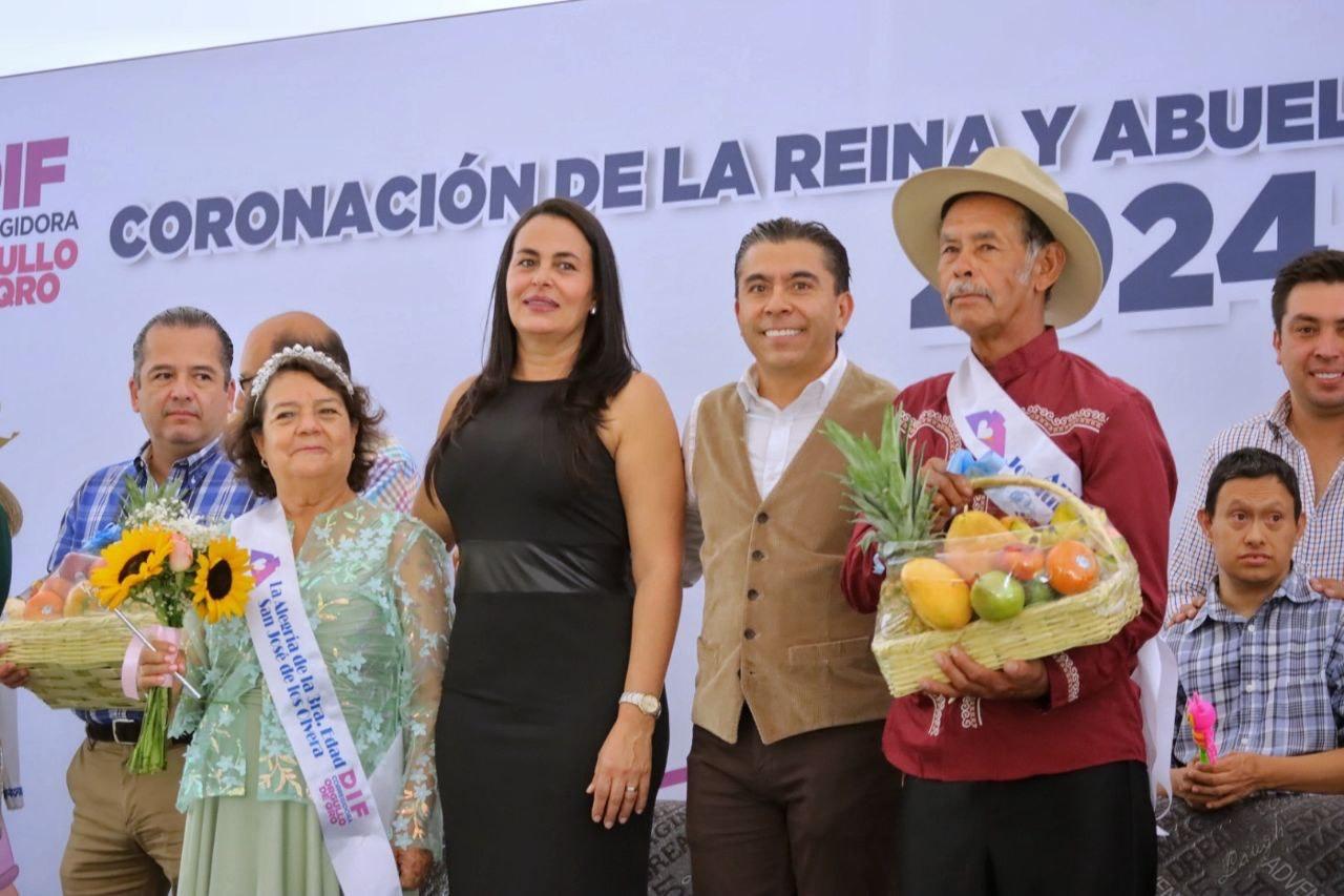 El presidente municipal de Corregidora, Roberto Sosa Pichardo, y su esposa Karina Antuñano Torres, presidenta del Patronato del Sistema DIF Municipal, llevaron a cabo la coronación de la Reina y el Abuelo de Oro.