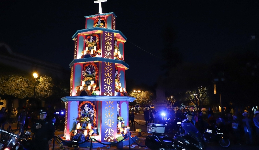 La titular de la Secretaría de Turismo del estado de Querétaro (SECTUR), Adriana Vega Vázquez Mellado, encabezó la ceremonia de inauguración del tradicional Altar de Muertos Monumental, que año con año se coloca en Plaza de Armas, y que, en esta edición está dedicado a la memoria de 13 policías estatales.
