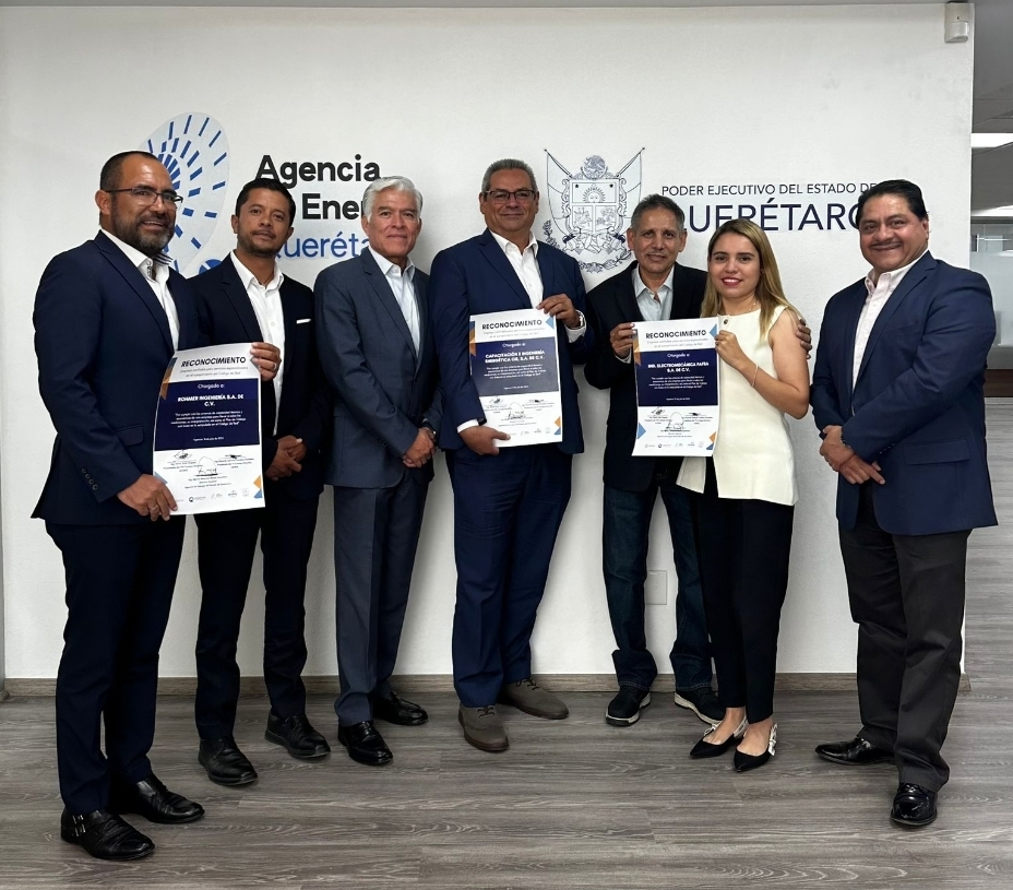 El director de la Agencia de Energía del estado de Querétaro, Mauricio Reyes, encabezó la entrega del reconocimiento “Empresa Confiable para servicios especializados en el cumplimiento del Código de Red”, por las acciones impulsadas por las firmas ROMHER, PAFRA, y CIE en materia de normas y requisitos técnicos que regulan la operación y el funcionamiento de los sistemas eléctricos.