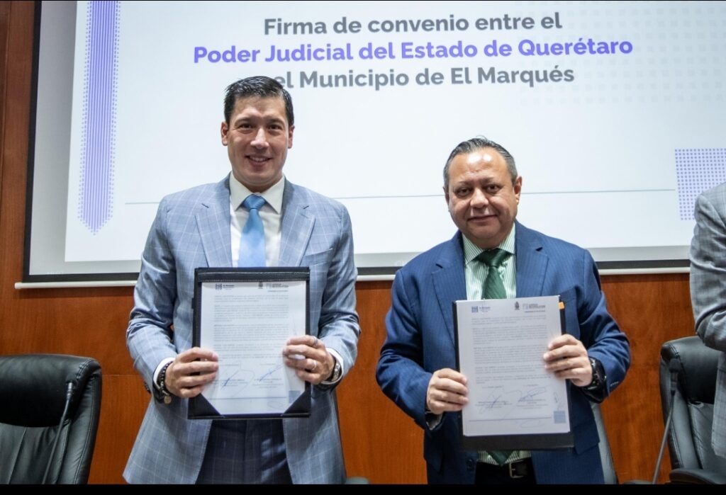 El presidente municipal de El Marqués, Rodrigo Monsalvo Castelán, en conjunto con el magistrado presidente del Poder Judicial del Estado de Querétaro, Braulio Guerra Urbiola firmaron un convenio de colaboración con el objetivo de contribuir para que la sociedad tenga justicia gratuita, pronta y expedita, mediante el uso de la tecnología digital.