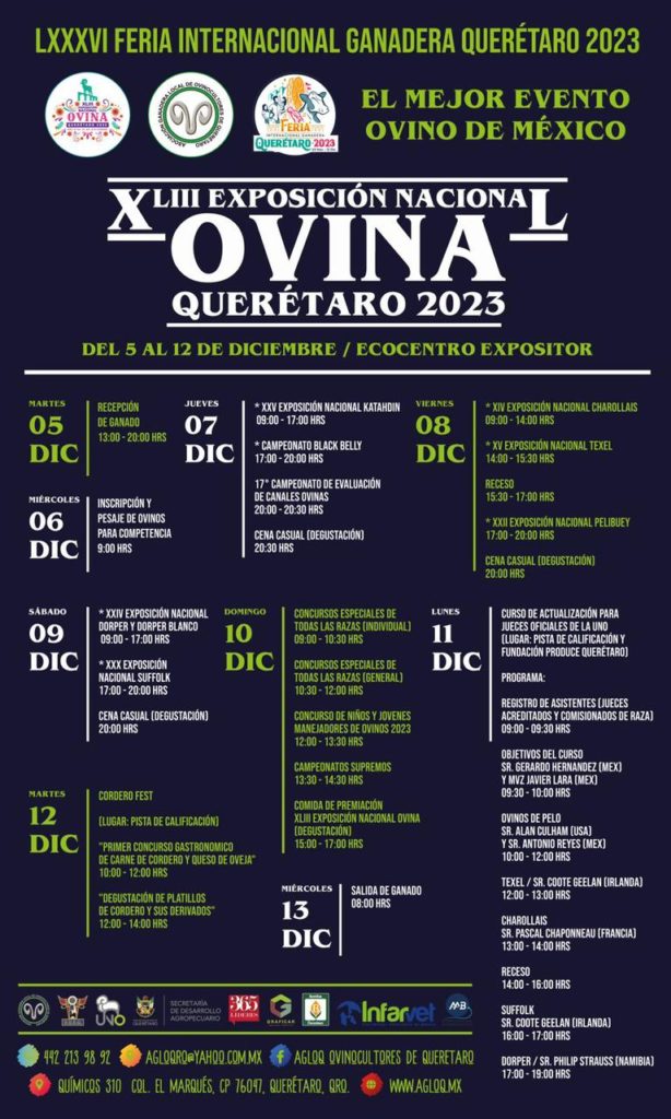 El mejor evento ovino de México estará en la Feria Internacional Ganadera Querétaro 2023, del 5 al 12 de diciembre, con exposiciones, campeonatos y concursos nacionales, con jueces internacionales de México, Estados Unidos, Irlanda y Francia.
