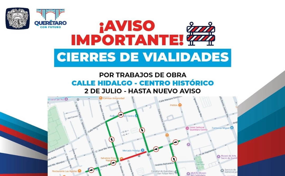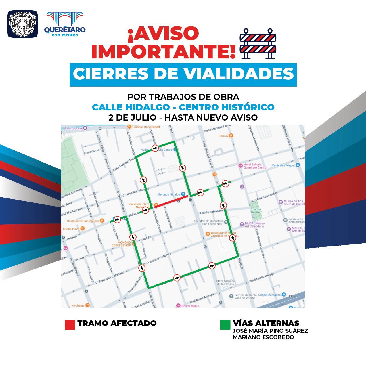 informa que a partir de este martes 2 de julio se implementó un cierre vial sobre la calle Hidalgo, en el tramo comprendido entre las calles Nicolás Campa y Ezequiel Montes, en el Centro Histórico de la ciudad.