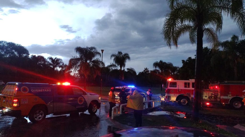 Para la zona de Juriquilla se registró también caída de granizo y fuertes rachas de viento. Aquí el personal de Protección Civil Municipal, Guardia Municipal y Bomberos de Querétaro, prestó auxilio al conductor de un vehículo que intentó cruzar una vialidad en Cumbres del Lago mientras se presentaba una corriente de agua que arrastró su vehículo.