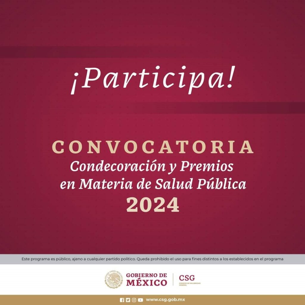 La Secretaría de Salud (SESA) del estado de Querétaro informa que el Consejo de Salubridad General (CSG) emite convocatoria para postular a personas para obtener la Condecoración y Premios en Salud Pública 2024, la cual está vigente hasta el 12 de febrero de 2024 a las 15:00 horas.