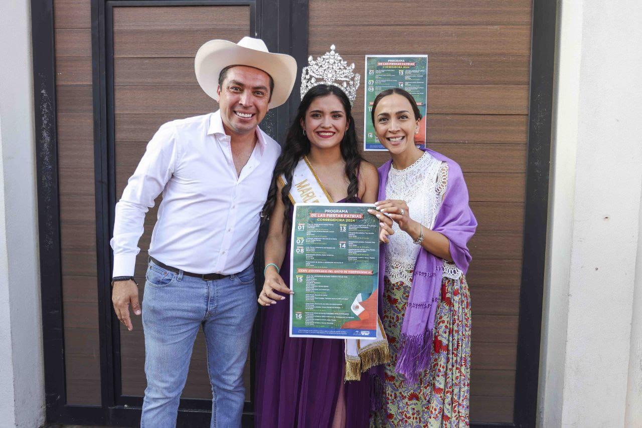 El presidente municipal de Corregidora, Adolfo Colín Sánchez, acompañado de su esposa, Mary Tere Favela García, quien es presidenta del Patronato del Sistema Municipal DIF, encabezó la pega de bando que anuncia el inicio de las Fiestas Patrias.