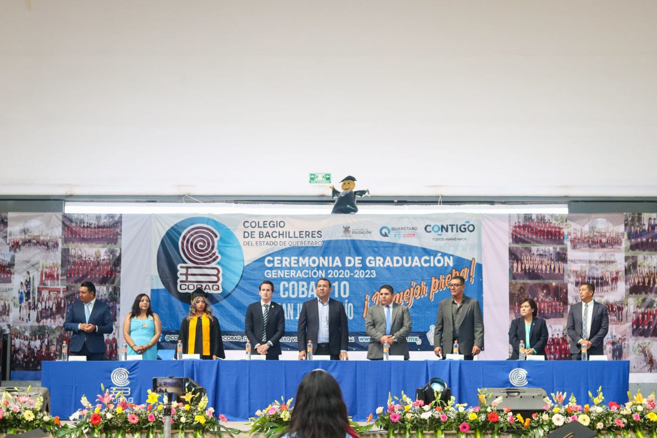 El presidente municipal de San Juan del Río, Roberto Cabrera Valencia, en equipo con autoridades del Colegio de Bachilleres del Estado de Querétaro (COBAQ), encabezó la Ceremonia de Graduación de la Generación 2020-2023 del COBAQ plantel 10, de la que egresaron 402 estudiantes.
