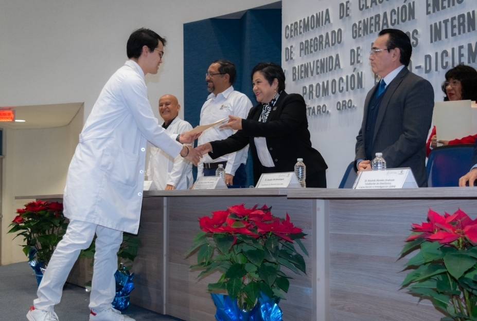 Asimismo, se dio la bienvenida a las y los médicos que inician esta nueva etapa de formación, a quienes se les exhortó a fortalecer sus conocimientos, habilidades y destrezas clínicas con empatía, ética y vocación de servicio, manteniendo como eje central el bienestar de las y los pacientes. En el evento participaron el director de Servicios Médicos Hospitalarios, Hugo Daniel Cerrillo Cruz; el subdirector de Enseñanza, Eduardo Morales Andrade; la jefa del Departamento de Enseñanza, Alma Yadira Guevara Rico; el director del Hospital General de Querétaro, Leopoldo Espinoza Feregrino, entre otras personalidades.