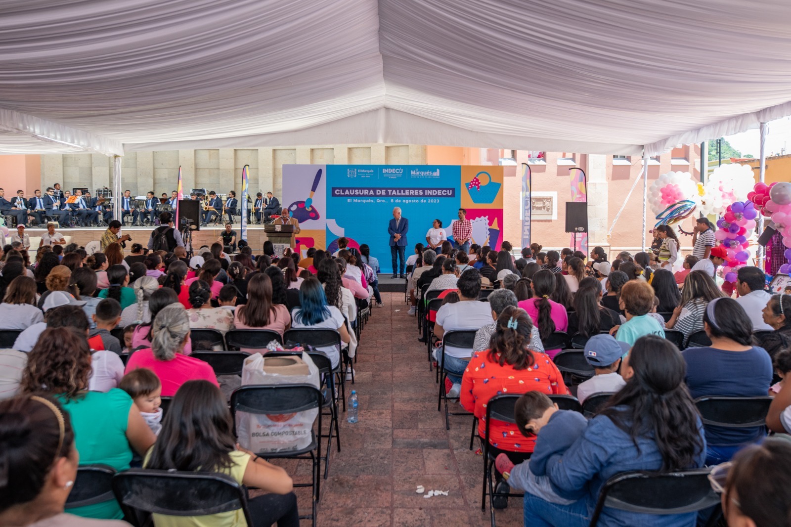 El presidente municipal de El Marqués, Enrique Vega Carriles, encabezó la clausura de talleres de decoración moderna en globo, elaboración de piñatas, pintura en tela, repostería y bolsa de toquillo, impartidos simultáneamente por personal del Instituto Municipal del Deporte y la Cultura, (INDECU), en 30 localidades y fraccionamientos del municipio.