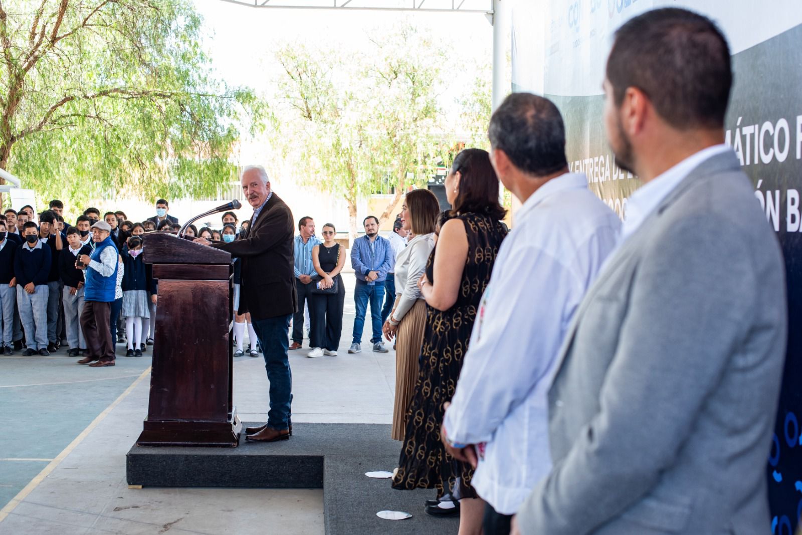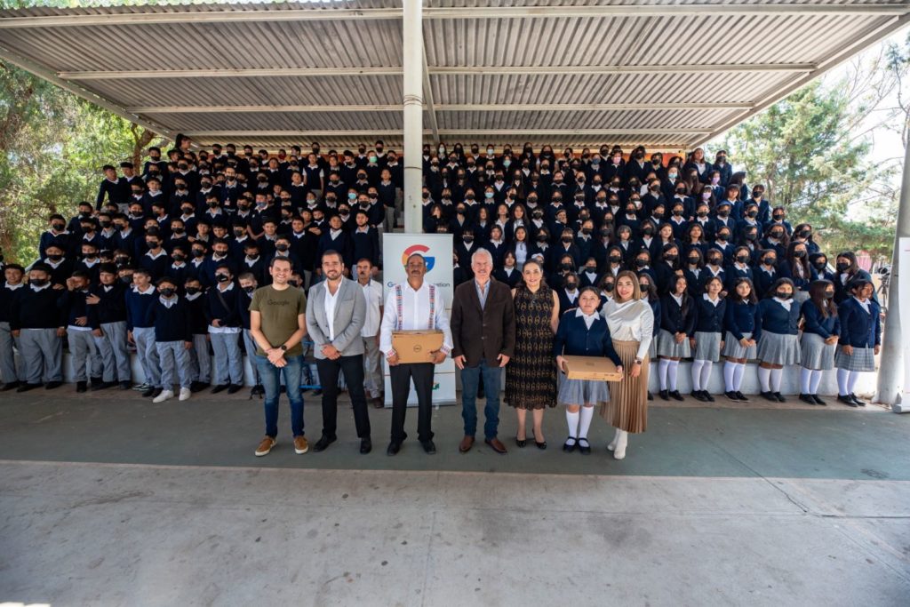 Al evento asistieron Rodrigo Mesa Jiménez, secretario del Ayuntamiento; Aydé Espinoza González, secretaria de Desarrollo Social; Carlos Anaya López, representante de Google; Casiano Velasco, director del plantel; y Nataly Chávez Monroy, representante de alumnos.