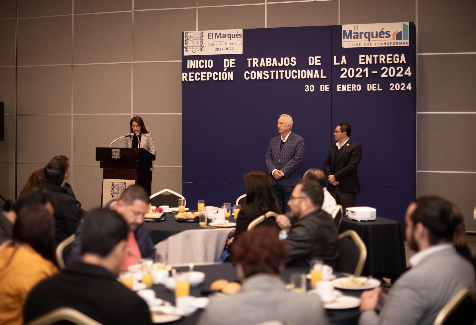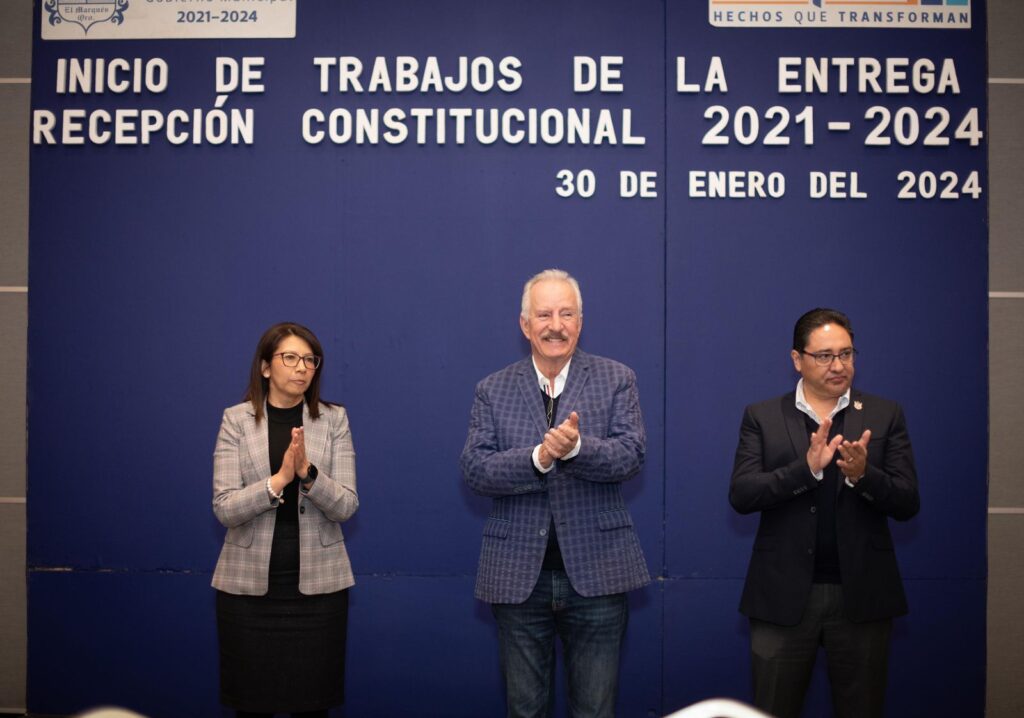 El presidente municipal de El Marqués, Enrique Vega Carriles, acompañado por el secretario de la Contraloría en el Estado de Querétaro, Óscar García González y la auditora Superior Municipal, María Leonor Hernández Montes, encabezó el inicio de trabajos de la “entrega recepción constitucional 2021-2024″