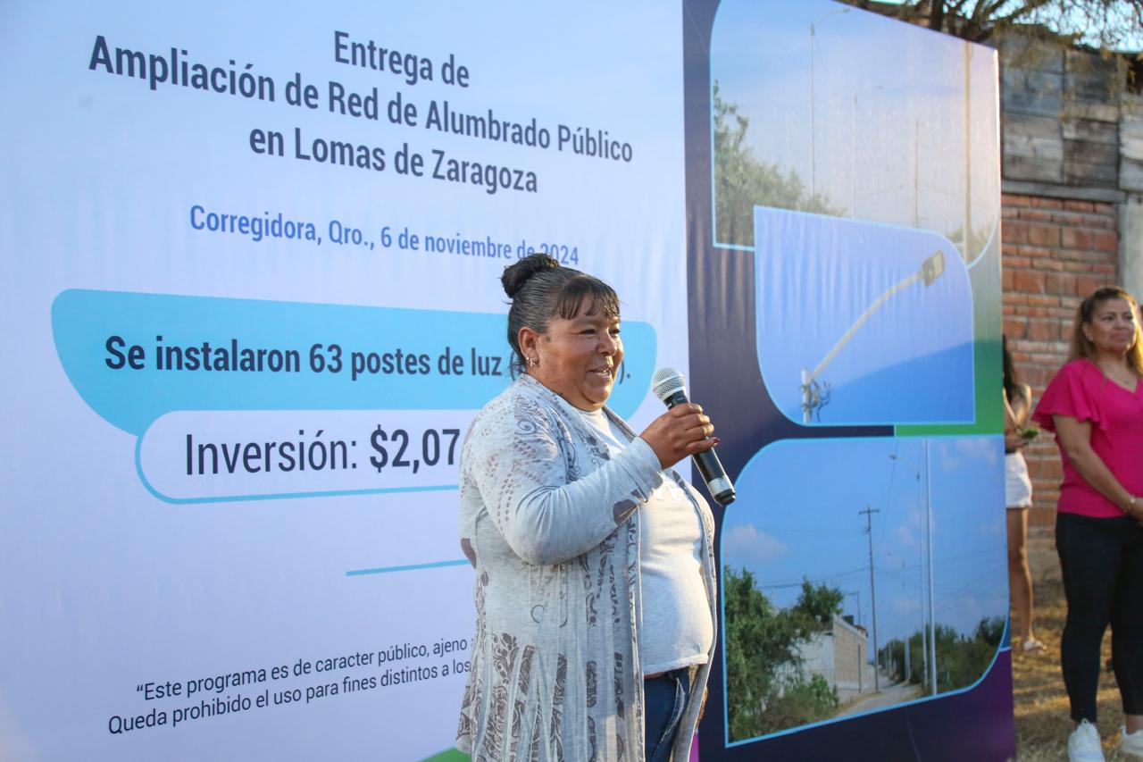 Por su parte, Viridiana Nava, titular de la Secretaría de Obras Públicas del Municipio de Corregidora, detalló que se llevó a cabo la instalación de una red de alumbrado público en diversas colonias y comunidades del municipio, con un total de 1,345 nuevas luminarias. De estas, 63 fueron destinadas a la comunidad de Lomas de Zaragoza.
