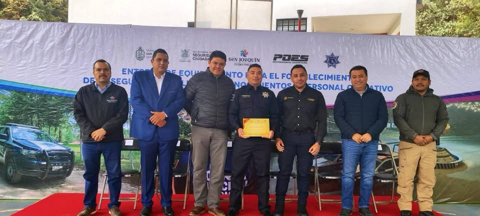 El Presidente Municipal de San Joaquín, Mtro. Carlos Manuel Ledesma Robles y el Secretario de Seguridad Ciudadana, Lic. Iován Elías Pérez Hernández, acompañados por el Presidente Municipal de Jalpan de Serra, Lic. Rubén Hernández Robles, así como de Regidores y funcionarios de la Administración Pública, realizaron la “Entrega de Equipamiento para el Fortalecimiento de la Seguridad Pública y el Reconocimiento a Personal Operativo de la Secretaría de Seguridad Pública y Tránsito de San Joaquín”.