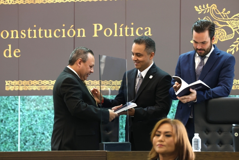 En Sesión Solemne de Pleno de la LXI Legislatura, el secretario de Gobierno, Eric Gudiño Torres, en representación del gobernador, Mauricio Kuri González, entregó al presidente de la Mesa Directiva, diputado Gerardo Ángeles Herrera, el informe escrito 2024-2025 del Poder Ejecutivo del Estado, correspondiente al cuarto año de ejercicio constitucional con fundamento en el Artículo 22 Fracción X de la Constitución Política local.