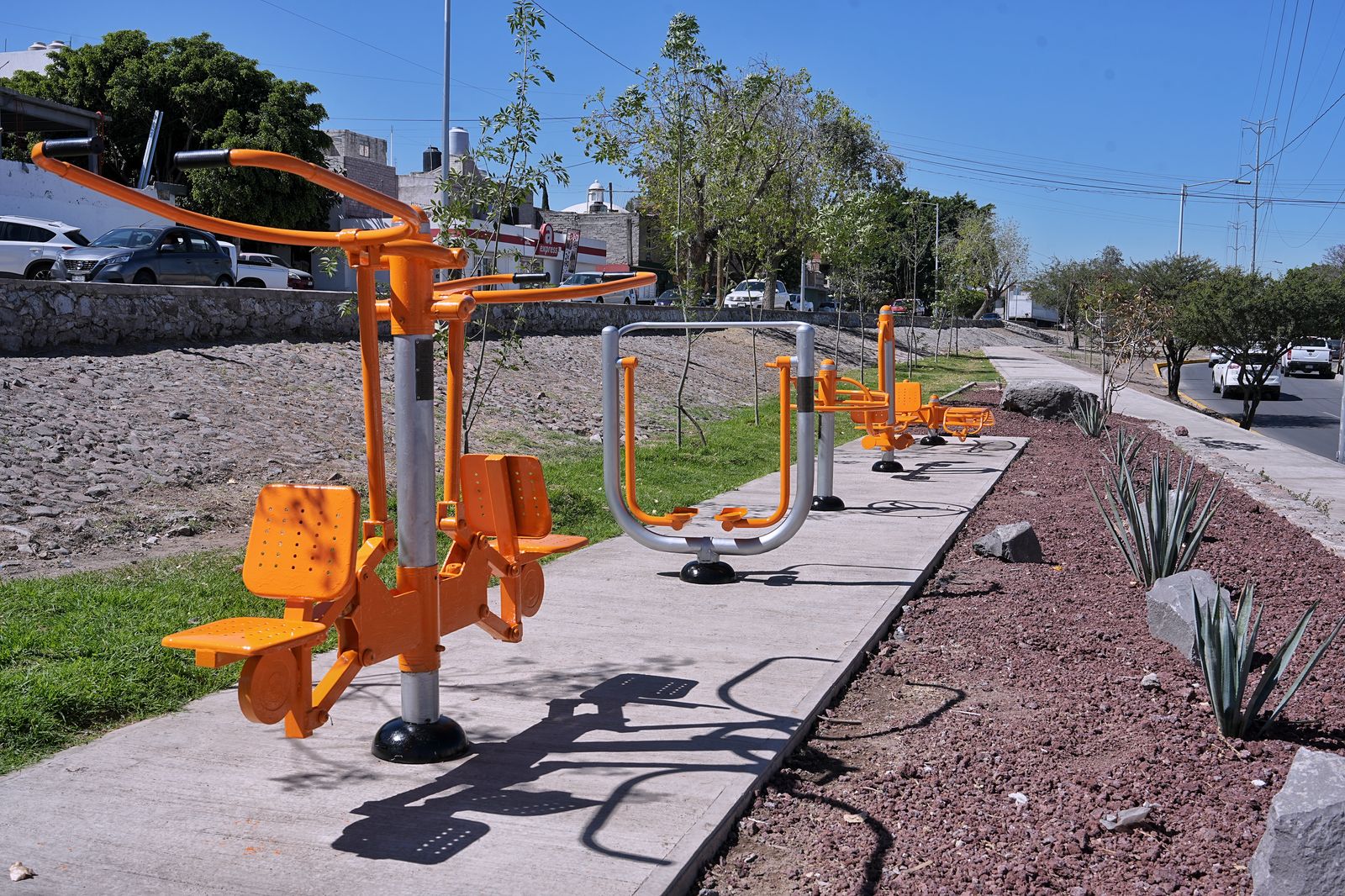 - Para la rehabilitación y mantenimiento de los aparatos de ejercicio al aire libre se construyó una plancha de concreto de 55 metro cuadrados; para la rehabilitación del camellón en la Avenida 4 se realizó la limpieza de canchas y perfilado de banquetas y taludes; se reconstruyó la banqueta, el andador y murete en escalera; se realizó el borrado de grafiti, pintado de jardineras y guarniciones.