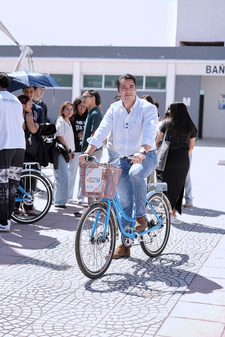 “Ahora aquí en nuestro campus Aeropuerto le estamos entrando con 105 bicicletas del sistema compartido, para que ustedes puedan desplazarse de manera efectiva dentro del campus, que llegue rápido a sus clases de manera segura y también como dijo Pedro, encargarles muchísimo que cuiden este sistema que lo usen bien y que, insisto, es el arranque, falta mucho más por hacer en materia de movilidad, pero este es un primer granito de arena, un resultado muy tangible y palpable para que ustedes vean el compromiso que tenemos de hacer equipo con la Universidad Autónoma de Querétaro”, señaló el alcalde.