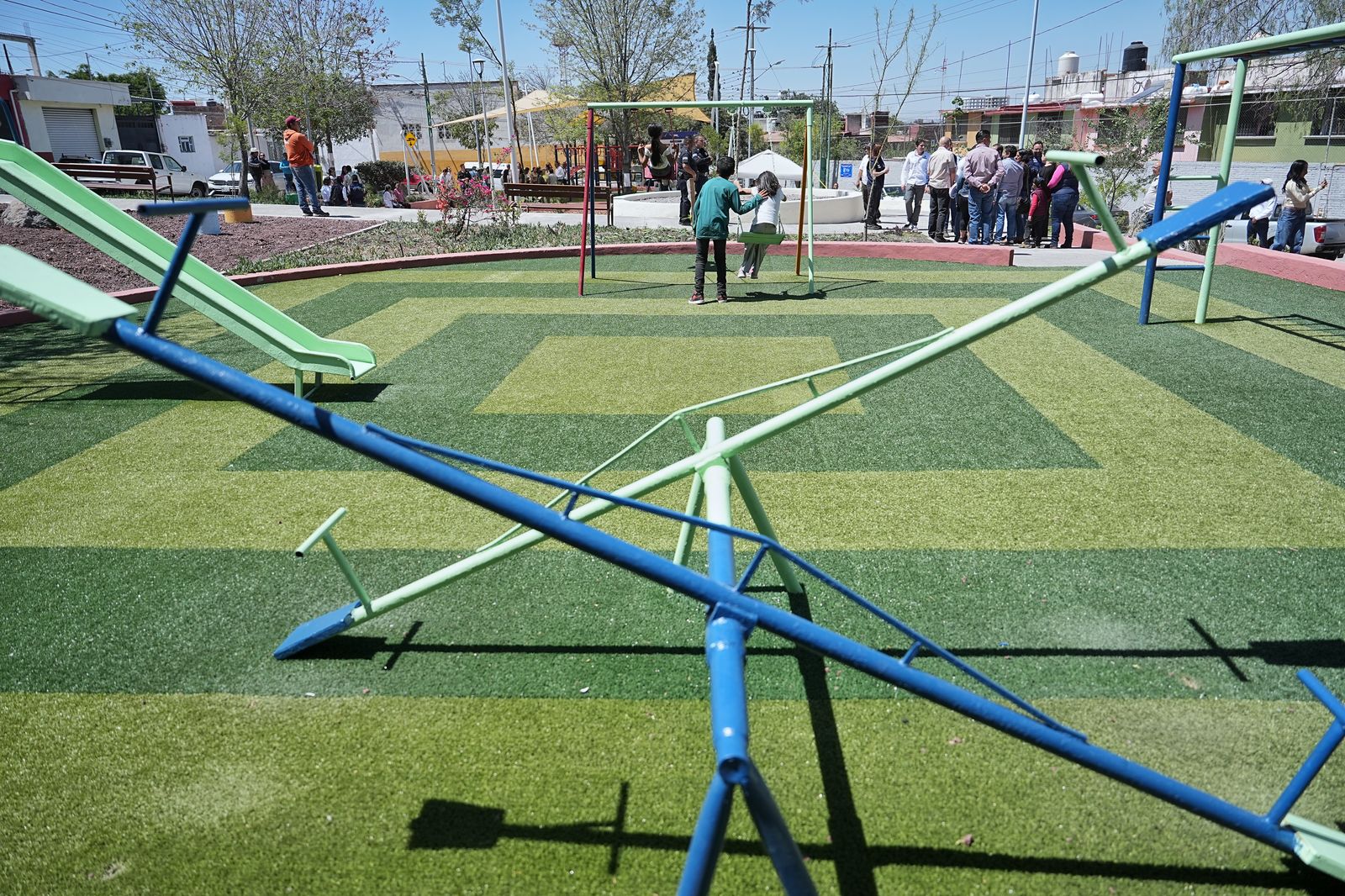 - Mientras que, en la rehabilitación del parque, se llevó a cabo la instalación de una velaria y un sistema de riego por aspersión, la definición de caminos con texturizado, la colocación de nuevos ejercitadores, bancas, pasto sintético y luminarias, así como la rehabilitación de juegos infantiles y la reforestación del área. Este espacio, que antes era poco utilizado por las familias y donde se acumulaba basura, hoy es un lugar digno y seguro que fortalece el tejido social y brinda a la comunidad un punto de encuentro para la sana convivencia y el disfrute de las familias.