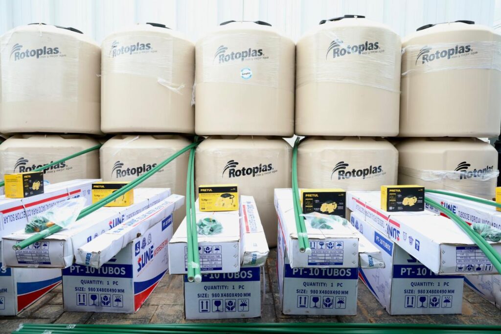 Los productos ofrecidos incluyen tinacos y cisternas para almacenamiento de agua; calentadores solares para ahorro de energía; láminas y bultos de cemento para construcción; carretillas con herramientas para trabajo; juegos de baño y colchones.