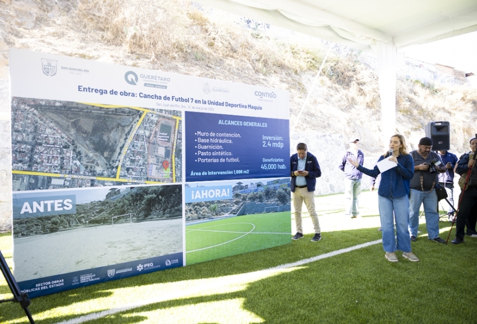 Con el objetivo de fomentar el deporte y la sana convivencia en San Juan del Río, el gobernador, Mauricio Kuri González, en compañía del alcalde, Roberto Cabrera Valencia, entregó una cancha de fútbol 7 en la Unidad Deportiva Maquío, la cual representó una inversión de 2.4 millones de pesos en beneficio de más de 45 mil habitantes.
