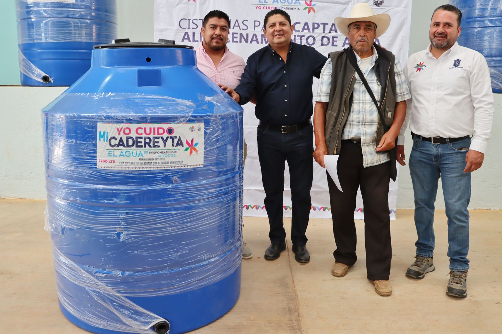 El Presidente Municipal de Cadereyta, Lic. Miguel Martínez Peñaloza entregó esta mañana 584 cisternas a los habitantes de 17 comunidades pertenecientes a la delegación de La Esperanza, encuentro donde el alcalde reiteró que el programa Yo Cuido Cadereyta contempla la entrega de 22 mil depósitos con capacidad de 1,200 litros a igual número de casas habitación en el municipio de Cadereyta.