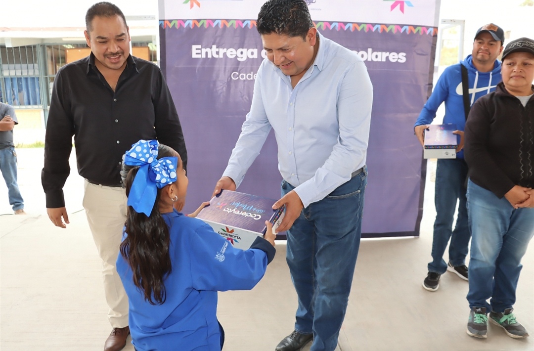 Más de 780 niñas y niños de instituciones educativas localizadas en siete comunidades recibieron este día zapatos deportivos de manos del presidente municipal Miguel Martínez Peñaloza. Este jueves el presidente municipal Miguel Martínez Peñaloza encabezó la entrega de tenis a estudiantes de nivel preescolar y primaria en comunidades de la zona norte de Cadereyta.