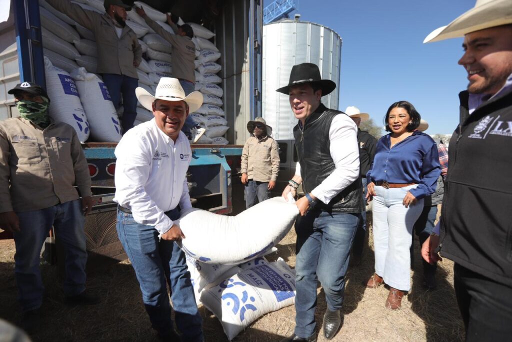 El secretario de Desarrollo Agropecuario, Rosendo Anaya, encabezó en el municipio de El Marqués la entrega de 414 toneladas de maíz, como apoyo emergente a mil 310 productores que sufrieron la afectación de dos mil 760 hectáreas por la falta de agua y pérdida de fertilidad en los suelos.