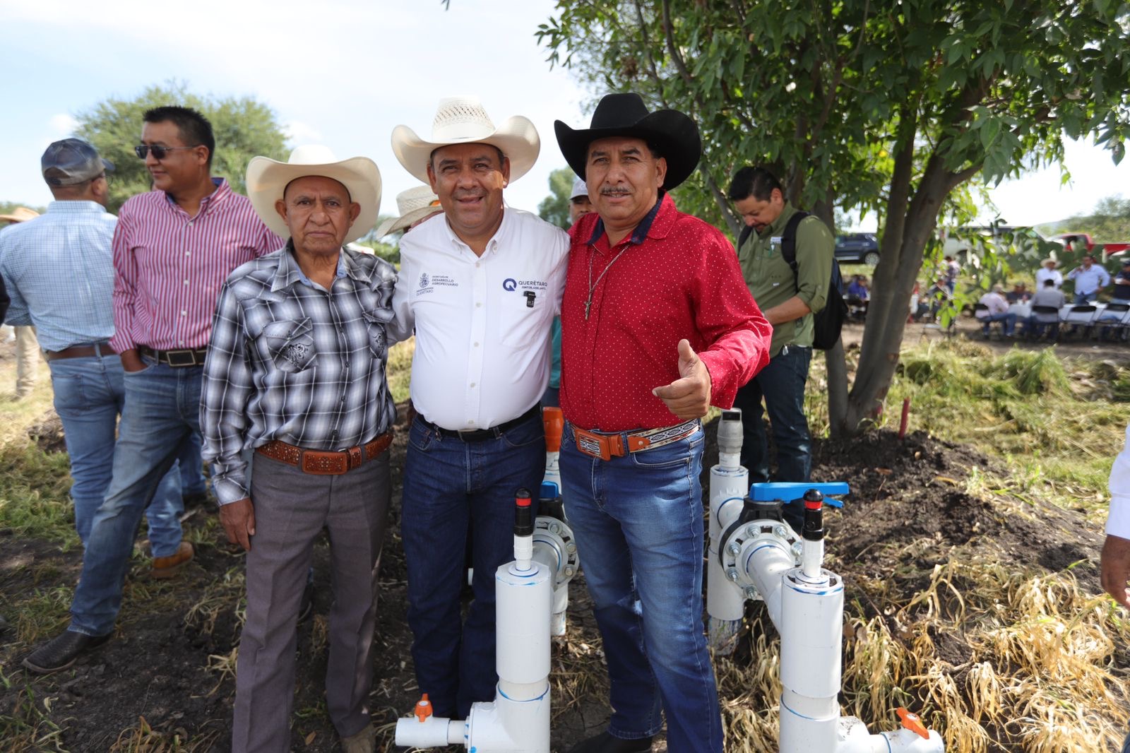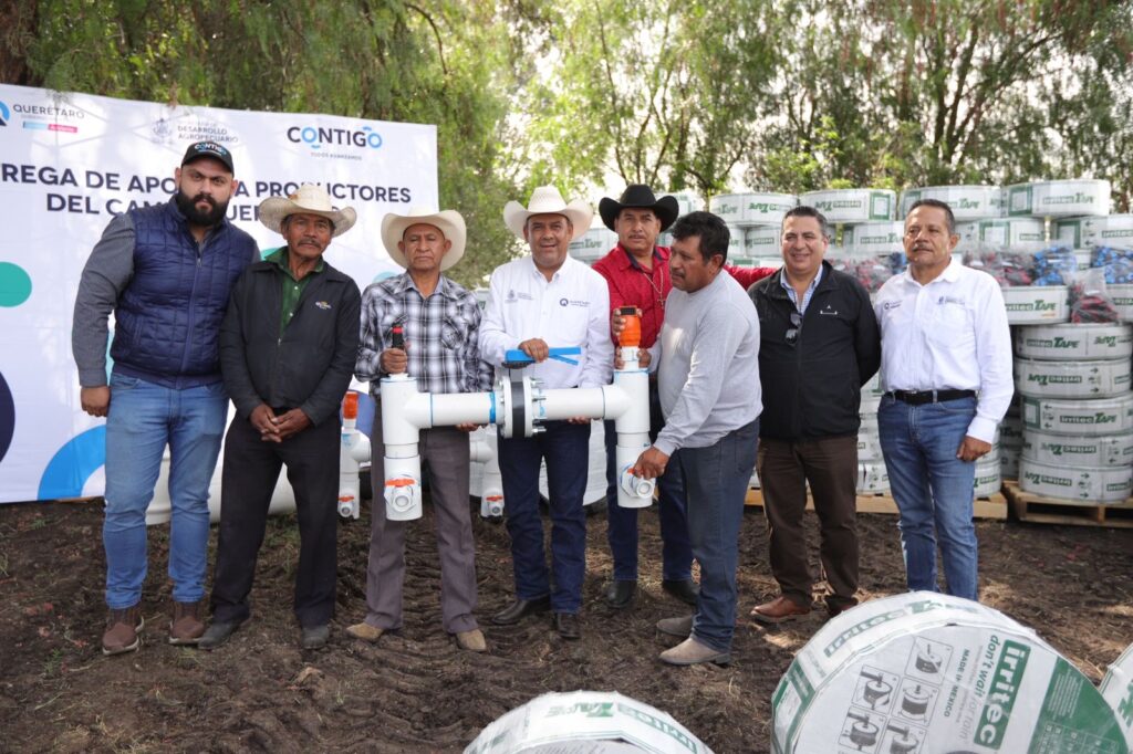 El secretario de Desarrollo Agropecuario, Rosendo Anaya Aguilar, llevó a cabo la entrega  de oficios de autorización de apoyo con sistema de riego por goteo a productores en la comunidad  de La Valla, en San Juan del Río, lo que beneficia a 30 productores beneficiados para una superficie cercana a las 107  hectáreas, con una bolsa compuesta por una aportación estatal de cinco millones 372 mil pesos, sumados a la aportación de los productores por dos millones 384  mil pesos, para una inversión total de siete millones 756 mil pesos.