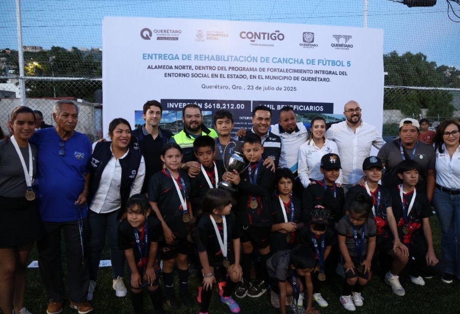 Como parte del programa de Fortalecimiento Integral del Entorno Social, el secretario de Desarrollo Social, Luis Nava, encabezó la entrega de la rehabilitación de la cancha de fútbol 5 en Alameda Norte en el municipio de Querétaro, donde resaltó que este tipo de obras contribuyen a generar espacios de encuentro comunitario, convivencia y desarrollo para niñas, niños, jóvenes y adultos, lo cual abona al fortalecimiento del tejido social en dicha zona.