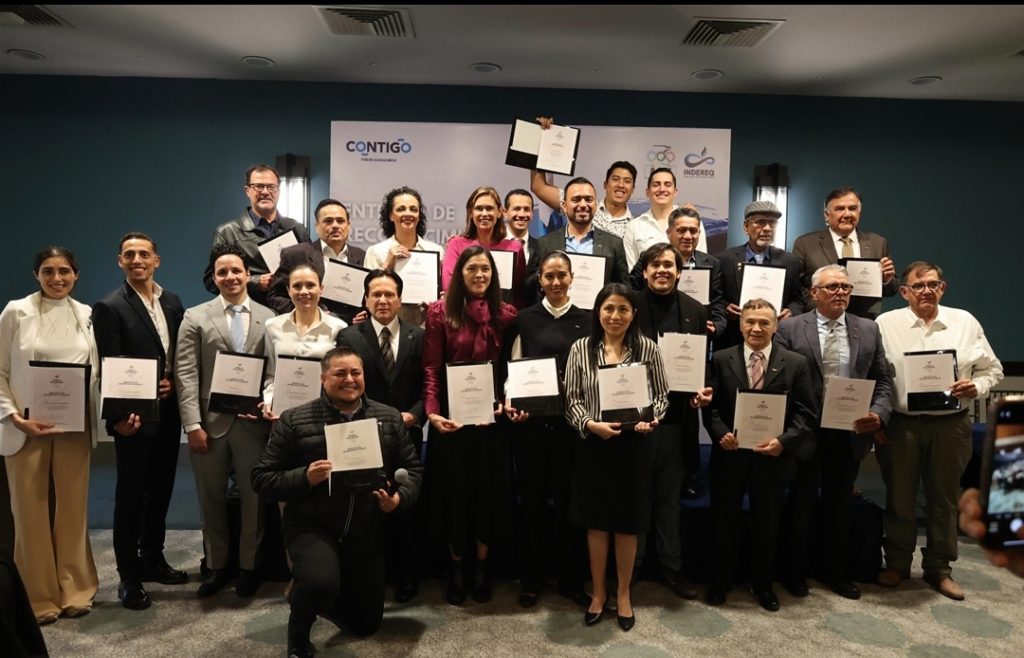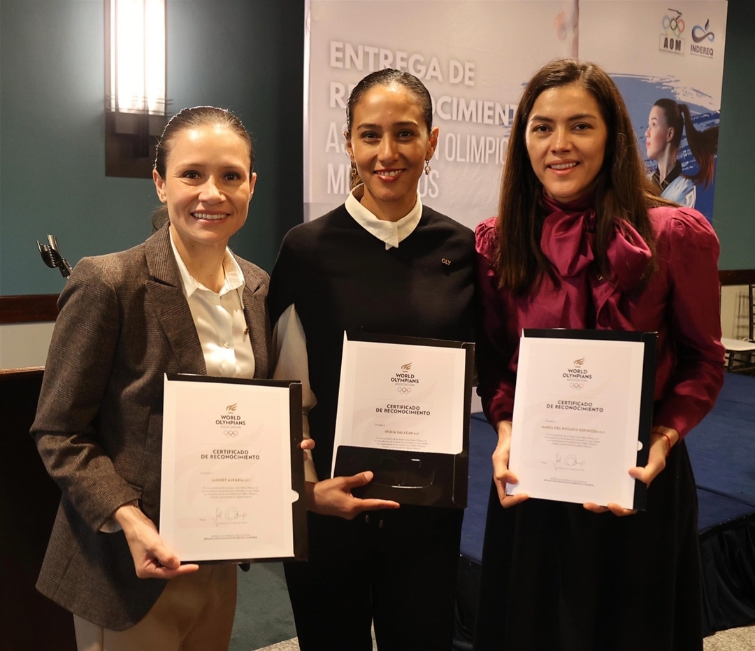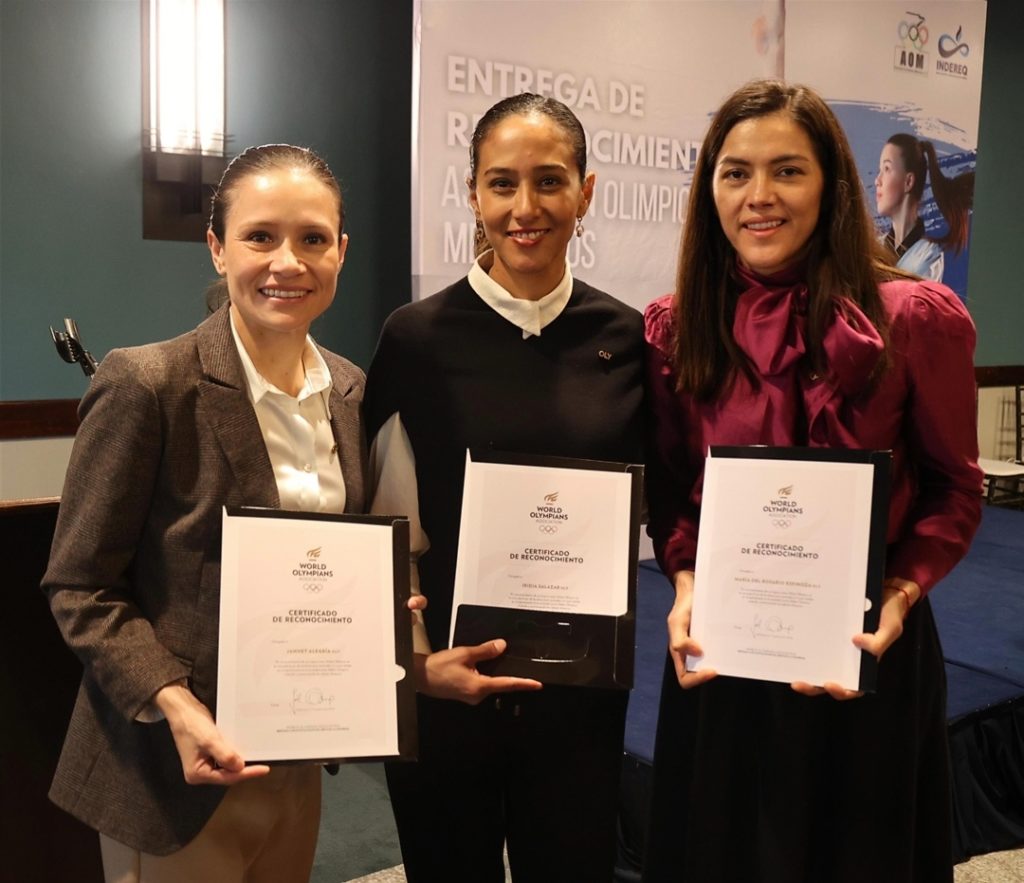 La directora general del Instituto del Deporte y la Recreación del Estado de Querétaro (INDEREQ) Iridia Salazar Blanco, junto con el presidente de la Asociación de Olímpicos Mexicanos A.C., Daniel Aceves, entregaron los reconocimientos “OLY” a deportistas de nuestro país que lograron competir en Juegos Olímpicos.