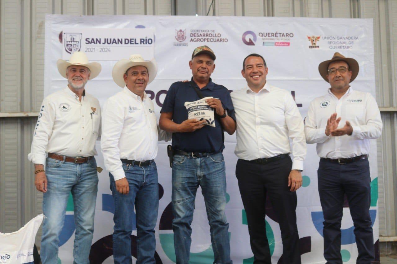 En beneficio de 383 productores del campo del municipio de San Juan del Río, el secretario de Desarrollo Agropecuario del estado de Querétaro, Rosendo Anaya Aguilar, y el presidente municipal de San Juan del Río, Roberto Cabrera Valencia, entregaron más de 66 toneladas de avena, con lo cual será posible sembrar 663 hectáreas de este producto.