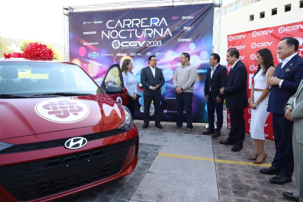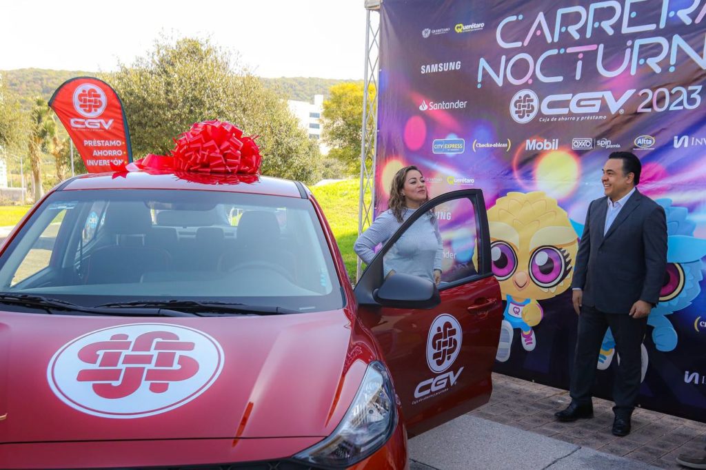 El Presidente Municipal de Querétaro, Luis Nava, en compañía del Director General de la Caja Gonzalo Vega, Enrique Díaz Hernández, entregó a Karen Aracelí Ordaz, las llaves del vehículo que se ganó en el sorteo que se realizó entre los 5 mil corredores inscritos en la Carrera Nocturna CGV 2023, que se celebró el pasado 27 de octubre en el Centro Histórico.