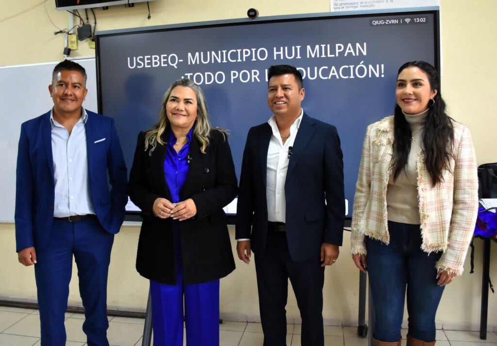 En la escuela «Álvaro Obregón», la titular de la USEBEQ, acompañada del presidente municipal, Jairo Iván Morales Martínez, destacó la instrucción de Mauricio Kuri González para trabajar por un gobierno innovador que sea agente generador de la transformación educativa, con el objetivo de fortalecer la educación de calidad con equidad en el acceso al conocimiento de las y los alumnos a través del uso de las nuevas tecnologías.