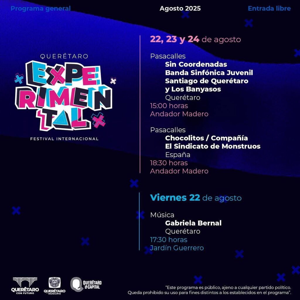 Este fin de semana inicia el Festival Querétaro Experimental organizado por el Municipio de Querétaro a través de la Secretaría de Cultura y será un escenario para resaltar el talento local y presentar lo mejor de la música, danza, teatro, circo y pasacalles que estarán al alcance de las y los asistentes los días viernes 22, sábado 23 y domingo 24 de agosto.