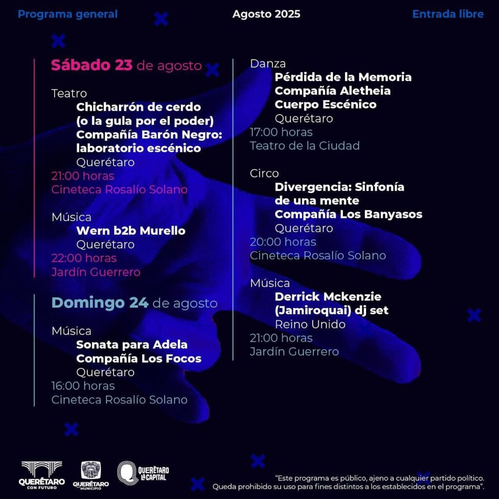 El programa del festival inicia este viernes 22 de agosto con el pasacalles Sin Coordenadas, a cargo de la Banda Sinfónica Juvenil Santiago de Querétaro y Los Banyasos, a las 15:00 horas en el Andador Madero. Se trata de un recorrido acrobático con música en vivo y malabares que desafían la gravedad, mismo que también se presentará el sábado y domingo en el mismo horario. En este espacio también se presentará el segundo pasacalles Chocolitos de la compañía española Sindicato de los Monstruos, un espectáculo familiar protagonizado por dos personajes con trajes articulados que ofrecen movimientos realistas y fantásticos, con un mensaje sobre el cuidado ambiental, programado para viernes, sábado y domingo a las 18:30 horas. En la disciplina de danza destaca Claroscuro de la Compañía Luz y Sombra, una obra coreográfica que aborda la luz y la oscuridad, el duelo y la esperanza, el dolor y el placer, programada a las 20:00 horas en la Cineteca Rosalío Solano.