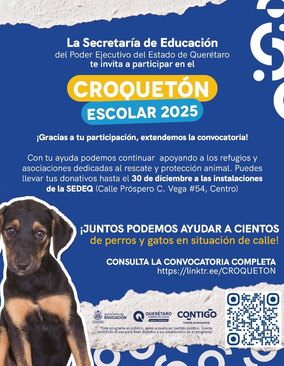 El llamado a la población para participar está vigente hasta el 30 de diciembre, y puede llevar sus donativos a las instalaciones de la Secretaría de Educación, ubicadas en calle Próspero C. Vega #54, colonia Centro, de lunes a viernes, en un horario de 9:30 a 16:00 horas; además se les invita a mantenerse informados a través de las redes sociales de la SEDEQ, en donde se estarán anunciando los distintos puntos de recepción en las escuelas previo a las entregas Croquetón 2025.