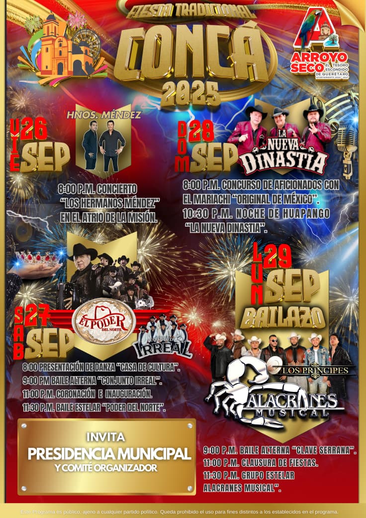 Posteriormente, se presentó el cartel de las fiestas, en el que destaca la presentación del grupo “Poder del Norte” el día 27 de septiembre, así como el baile de cierre de las festividades el 29 de septiembre, con la participación de “Alacranes Musical”. Finalmente, se dieron a conocer los resultados del cómputo, en el que —-, por lo que —- será coronada como soberana de las fiestas.
