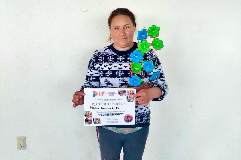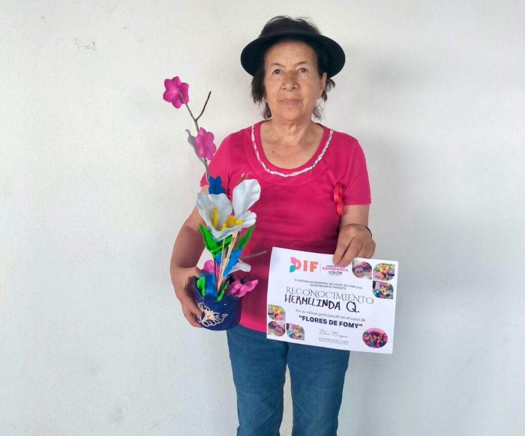 Como parte de las iniciativas del DIF municipal Colón, para impulsar y fortalecer la economía de las y los ciudadanos, esta tarde dio por finalizado el curso de autoempleo de elaboración de flores de foamy, impartido en la localidad de El Fuenteño.
