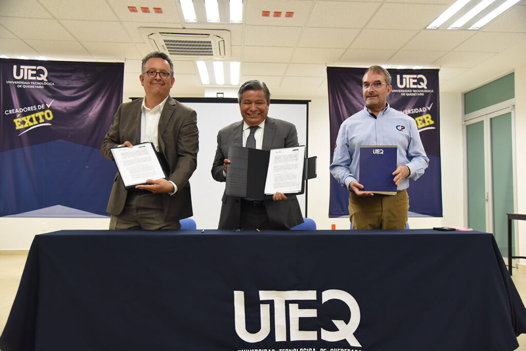 El rector de la Universidad Tecnológica de Querétaro, José Carlos Arredondo Velázquez, y el director General de la empresa alemana ARBURG México, Mario Rodríguez Navarro, encabezaron la firma de un acuerdo de comodato para que el Centro de Formación en Polímeros, de esta casa de estudios, acceda a maquinaria de inyección para materias termoplásticas.