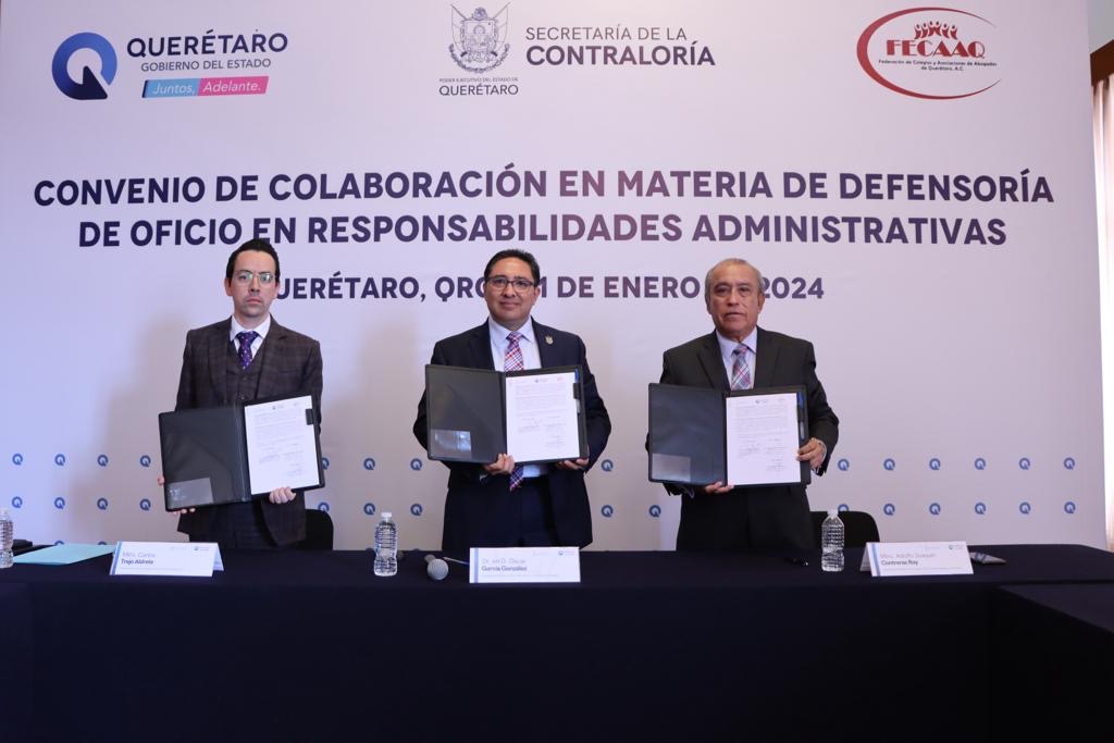 El secretario de la Contraloría, Oscar García González, firmó un convenio de colaboración con el presidente de la Federación de Colegios y Asociaciones de Abogados de Querétaro, A.C. (FECAAP), Adolfo Joaquín Contreras Roy, en materia de defensoría de oficio en responsabilidades administrativas.