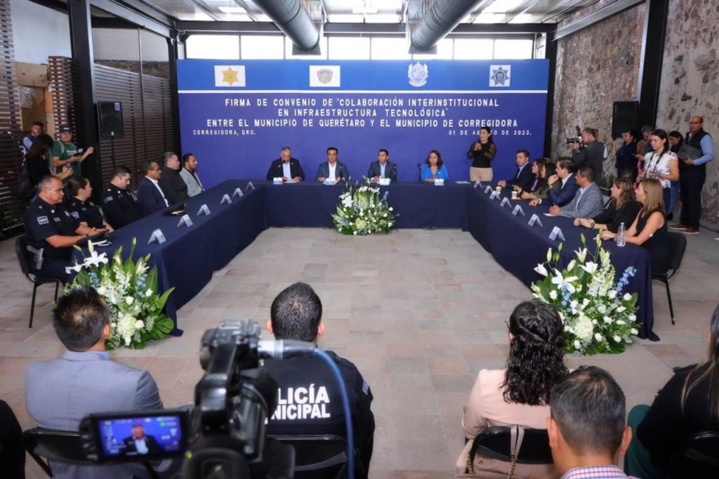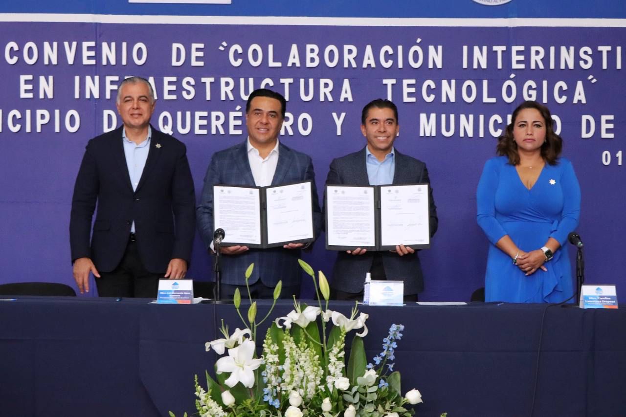 Fue firmado el Convenio de Colaboración Interinstitucional en Infraestructura Tecnológica en materia de seguridad, entre el Municipio de Corregidora y el Municipio de Querétaro, a fin de fortalecer la vigilancia en puntos estratégicos con el uso compartido de infraestructura.